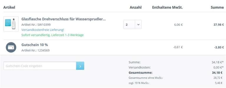So kommt man bei einer Bestellung von zwei Flaschen auf einen Endpreis von 34,18€.