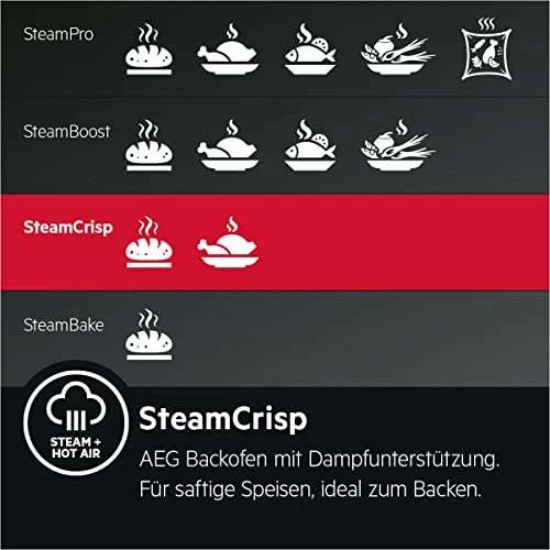 - SteamCrisp – Für außen knusprige und innen saftige Speisen kombinieren AEG SteamCrisp Dampfbacköfen schonenden Dampf mit herkömmlicher Hitze. Optimal für Brot, Fleisch, Geflügel, Ofengerichte – und ideal zum Backen und Braten