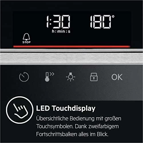 - LED Display mit Touchbedienung – Mittels fünf sensibler Touchsensoren lassen sich Konfigurationen im Handumdrehen vornehmen. Dimmbare LEDs heben einzelne Einstellungswerte wie Temperatur und Zeit während der Auswahl hervor. Die zweifarbige Temperaturkontrolle zeigt den Fortschritt der gewünschten Aufheiztemperatur