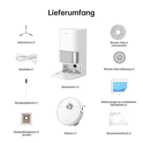 - [Spezifikationen] Im Paket enthalten: Roboter mit selbstreinigender Ladestation x1, Seitenbürste x1, Reinigungswerkzeug x1, Netzkabelx1, Staubbeutelx2, Mopps mit Halternx2, Mehrflächenreinigerx1, Bedienungsanleitung x1. Spezifikationen: Robotergröße 350x350x97 mm; Gewicht 3,7 kg; 2.4GHz WLAN-Verbindung; Nenneingang 100-240V 50/60Hz 0,5A; Akkukapazität 5200 mAh. Kompatibel mit Alexa, Siri, Google Assistant. Basis 303x403x399 mm, 3L Staubsammler, 2,5L(sauberer) und 2,4-l- (schmutziger) Wassertank