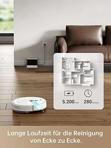 - Karten. Navigiert. Reinigt. – Mit der fortschrittlichen LDS-Kartierung lernt der D10s den Grundriss Ihrer Wohnung, um seine Routen zu planen und überall zu reinigen. Ein sensibler Bumper hilft Ihrem Roboter, Hindernisse sicher zu umfahren, um effektiv und effizient durch Ihre Wohnung zu navigieren