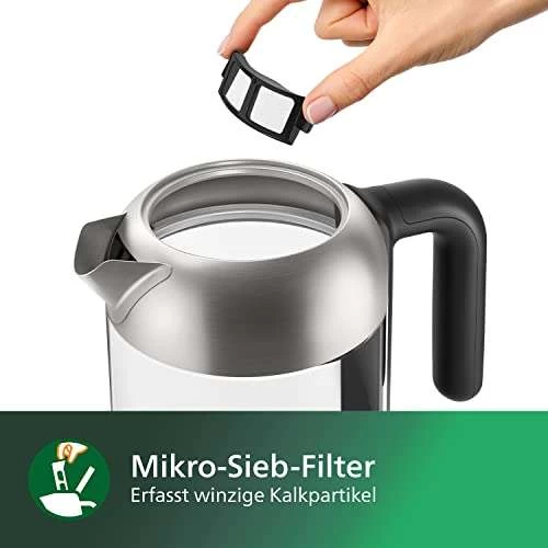 - Elegante und intuitive Sensorbeleuchtung: LED-Licht im Glasboden leuchtet auf, wenn der Wasserkocher eingeschaltet wird