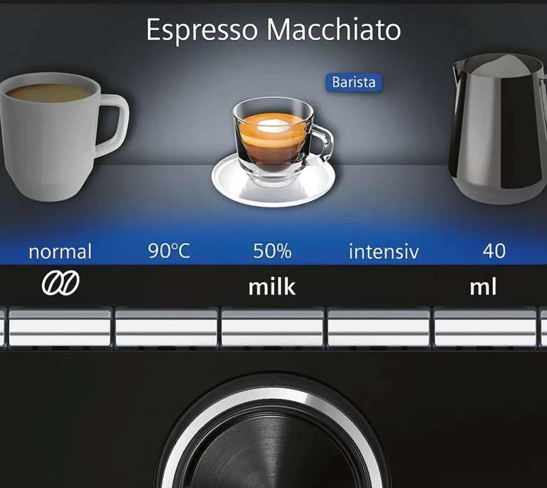 Vielseitige Kaffeeoptionen. Mit den vorprogrammierten Optionen für Cappuccino, Espresso, Heiße Milch, Kaffee und Latte Macchiato können Sie eine breite Palette von Kaffeespezialitäten nach Ihrem Geschmack zubereiten.