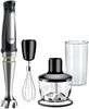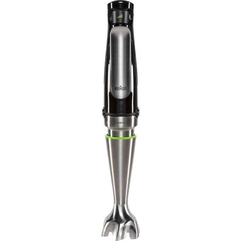 Mit der innovativen ActiveBlade Technologie ist der Braun MultiQuick 7 auch für die härtesten Anforderungen gerüstet. Die einzigartigen ActiveBlades bewegen sich auf und ab, um mühelos die härtesten Nahrungsmittel zu pürieren und die vergrößerte Schneidefläche sorgt für doppelt so feine Ergebnisse. Dank SmartSpeed lässt sich der MultiQuick 7 bequem mit nur einer Hand bedienen. Es gibt keine festen Geschwindigkeitsstufen, die Mixgeschwindigkeit wird über den Tastendruck gesteuert. Der Mixbecher fasst 600 ml und mit einer Skala in ml und fl oz ausgestattet. EasyClick Plus sorgt für einen einfachen und schnellen Wechsel der einzelnen Zubehörteile. Im Set enthalten sind ein Schneebesen zum einfachen Aufschlagen von Eischnee, Sahne oder luftigen Desserts sowie ein 500 ml Zerkleinerer. Mit ihm können Fleisch, Hartkäse und Nüsse zerkleinert werden.