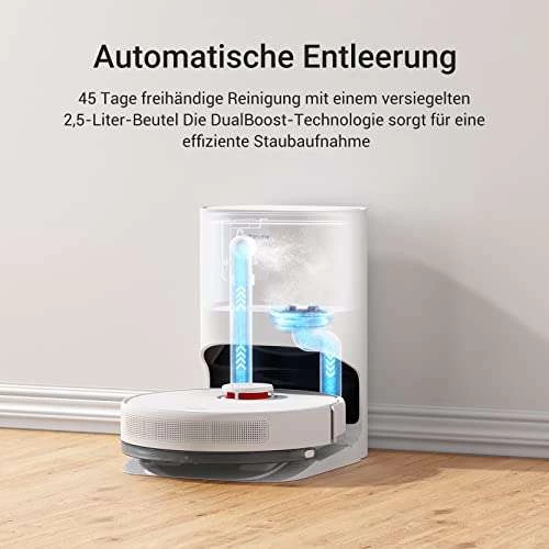 - [45 Tage freihändig] Nach jedem Reinigungsvorgang kehrt der D10 Plus Roboter automatisch zum 2,5-Liter-Auffangbehälter zurück, um den gesammelten Staub leise und präzise selbst zu entleeren. Die Entleerung des Roboters in nur 10 Sekunden minimiert die Unterbrechungen und optimiert die Reinigungszeit. Die DualBoost-Technologie fängt Staub effizient auf, ohne zu verstopfen – dank zweier Luftzirkulationswege, die Schmutz entfernen, Gerüche blockieren und Verstopfungen verhindern. Sie leeren den Sammelbehälter alle 45 Tage, um den täglichen Kontakt mit Staub und Sekundärverschmutzung zu vermeiden