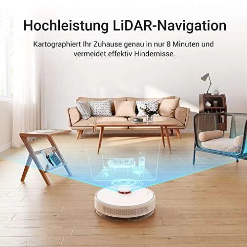 - [Intelligente Laser-LiDAR-Navigation] Der D10 Plus kann die Wohnung in nur 8 Minuten (100 m²) genau abbilden und Hindernissen ausweichen, um eine effiziente und effektive Reinigung zu ermöglichen, insbesondere in Räumen mit eng beieinander stehenden Möbeln. Sie können in einem Radius von 8 Metern scannen und die LiDAR-Navigation und einen SLAM-Algorithmus für dynamische Kartierung und intelligente Routenplanung nutzen: Genaue Erkennung, genauere Kartierung. Größerer Scan-Radius, schnelleres Mapping. Bessere Navigation, weniger Kollisionen