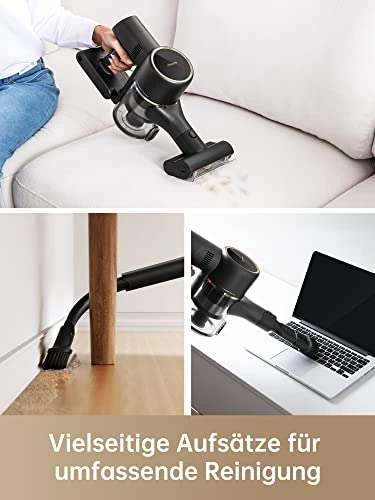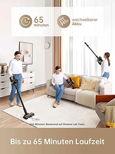 - Kontinuierliche und kraftvolle Reinigung – Genießen Sie bis zu 65 Minuten kabelloses Reinigen mit konstanter, starker Saugleistung. Reinigen Sie Ihr gesamtes Zuhause mit 150AW (20000Pa) Saugkraft dank eines 7x 3.000mAh Akkupacks und eines 108000RPM Hochgeschwindigkeits-bürstenlosen Motors für die Reinigung.
