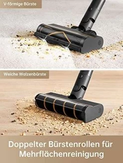 - Austauschbare Bürstenköpfe – Der Bürstenkopf für Mehrflächen und der anpassungsfähige Softrollen-Bürstenkopf entfernen Staub und Schmutz von verschiedenen Bodenbelägen mühelos. Die Flexibilität bei Bürstenwechseln erleichtert die Reinigung der Kanten und ist gründlicher.