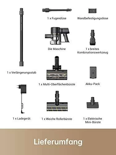 „Der bürstenlose Hochgeschwindigkeitsmotor mit 120.000 U/min erzeugt eine stabile Saugleistung zur effektiven Reinigung vieler verschiedener Bodenarten. Freuen Sie sich auf bis zu 65 Minuten ununterbrochene kabellose Reinigung mit gleichmäßiger, leistungsstarker Saugleistung ohne Saugverlust. Reinigen Sie Ihr gesamtes Zuhause mit einer Saugleistung von 150 AW – dank eines Akkus mit 7 x 3.000 mAh und einem bürstenlosen Hochgeschwindigkeitsmotor mit 120.000 U/min. So erfassen Sie überall Haare, Schmutz, Staub und Rückstände.“