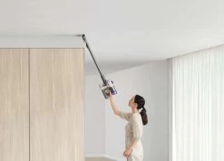 Der Dyson V8 ist der Dyson Akkustaubsauger der Basisklasse, mit dem du dein Zuhause von Staub befreist. Mit der Düse mit Anti-Hair-Wrap-Technologie saugst du problemlos Schmutz und Haare vom Boden auf. Da sich die Bürste dreht, wird auch Teppich gründlich gereinigt. Wenn der Akkustaubsauger aufgeladen ist, kann man damit 40 Minuten staubsaugen. So kannst du problemlos eine ganze Etage saubermachen. Man kann aus dem Akkustaubsauger einen Handstaubsauger machen und so auch andere Flächen als den Boden saugen. Mit dem 2-in-1-Zubehör kannst du deine Möbel absaugen. Zudem kannst du damit auch deine Bücherregale saugen. Die Fugendüse entfernt Staub von der Rückseite eines Schranks. Der Staubbehälter mit einem Fassungsvermögen von 0,54 Litern lässt sich mühelos öffnen und in den Mülleimer leeren. So kommst du selbst nicht mit Schmutz in Kontakt.