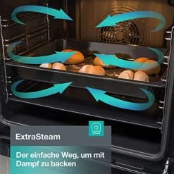 ExtraSteam: Programme, die mit ExtraSteam arbeiten, schaffen durch den Zusatz von Dampf die perfekte Umgebung im Gerät, die Ihr Brot garantiert aufgehen lassen und unwiderstehlich knusprig macht. Dafür müssen Sie nur etwas Wasser in ein Backblech geben, ein ExtraSteam-Programm auswählen und den Ofen die restliche Arbeit machen lassen