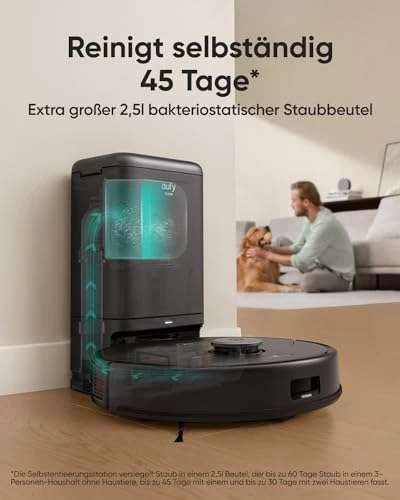 - 45 TAGE REINIGUNG OHNE DEIN ZUTUN: Die Selbstentleerungsstation des X8 Pro hat einen 2,5l bakteriostatischen Staubbeutel, der Tierhaare und Schmutz sicher einschließt – für ein wirklich müheloses Reinigungserlebnis.
