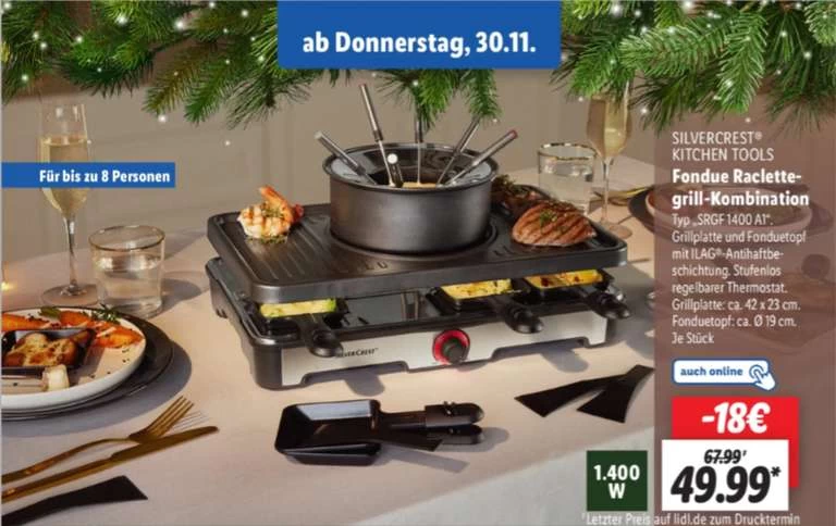 Eine Fondue-Raclettegrill-Kombination 49,99 € für bis zu 8 Personen.
