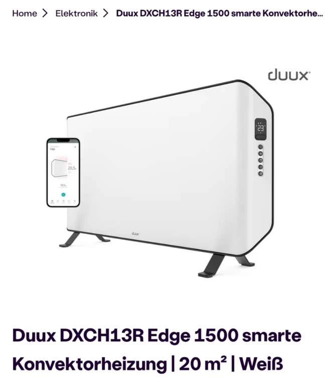 Über Ibood bekommt Ihr aktuell die Konvektorheizung DXCH13R Edge von Duux in weiß für 88,90€ inkl. Versand. Nächstbester Preis liegt bei 130€ nach Idealo. Es handelt sich um einen Bestpreis mit einer eff. Ersparnis von 31.62%. Das größere Modell mit 2000W ist ebenso für 108,90€ inkl. Versand verfügbar. Hier liegt nächstbester Preis bei 159€, was einer eff. Ersparnis von 31.13% entspricht. Denkt bitte an den von Euch zu tragenden evtl. Rückversand.