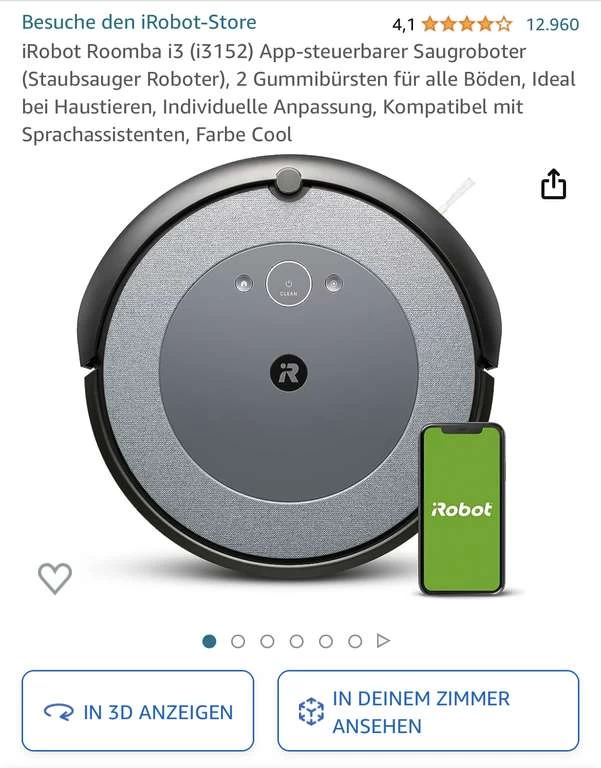 iRobot Roomba i3 (i3152) App-steuerbarer Saugroboter (Staubsauger Roboter), 2 Gummibürsten für alle Böden, Ideal bei Haustieren, Individuelle Anpassung, Kompatibel mit Sprachassistenten, Farbe Cool