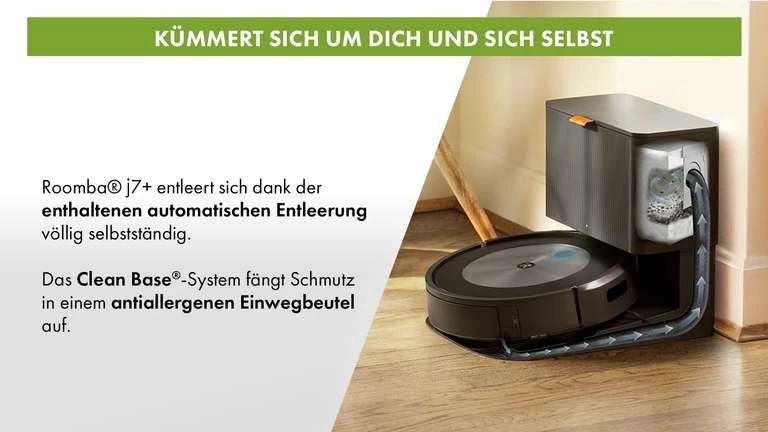 Staubsaugen erledigt sich jetzt monatelang von selbst, dank der Clean Base® Automatischen Absaugstation, mit der sich der Roomba® j7+ Saugroboter selbst in die Anti-Allergen Beutel entleeren kann.