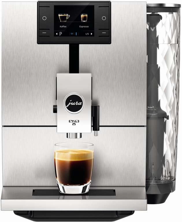 Das weltweit erste Vollautomaten-Gehäuse aus massivem, 3 Millimeter starkem Aluminium umhüllt die ENA 8 Signature Line. Es besticht durch absolute Präzision und hochwertige Oberflächenbeschaffenheit. Details, wie die Rundung der Seitenwände in einem 4000er-Radius oder akkurat gebrochene Kanten, prägen das Aussehen dieses Meisterstückes aus traditioneller Handwerkskunst in Kombination mit aufwendiger, moderner Fertigungstechnologie. Das 2,8″“- TFT -Touchscreen-Farbdisplay für intuitives Bedienen verschmilzt optisch mit dem mondänen Gehäuse aus hochwertigem Kunststoff. Edle Chromelemente akzentuieren das klare Design subtil. Künstliche Intelligenz: die am häufigsten bezogenen Produkte ordnen sich automatisch auf den Plätzen 1 – 2 (bzw. 1 – 4) auf dem Display an. 12 Spezialitäten auf Knopfdruck – inkl. Cortado und Caffè Barista. Zusätzlich kann ein Lungo Barista über die JURA-App J.O.E.® zubereitet werden. One-Touch-Funktion. Intelligentes Vorheizen. Kompatibel mit JURA-App J.O.E.® (Smart Connect separat erhältlich). Das Intelligent Water System (I.W.S.®) erkennt den Filter automatisch. CLARIS Smart mini oder CLARIS Smart liefern perfekte Wasserqualität. Spülmaschinenfestes Schalensystem. Wireless ready in Verbindung mit dem Cool Control Wireless 0,6 Liter.