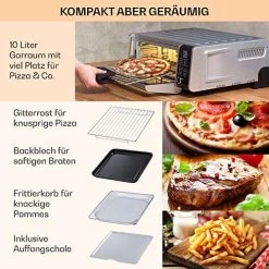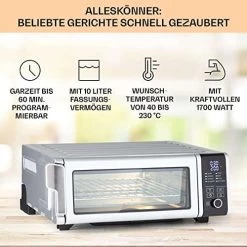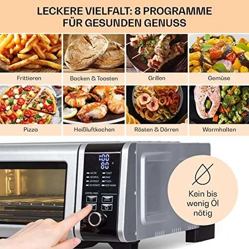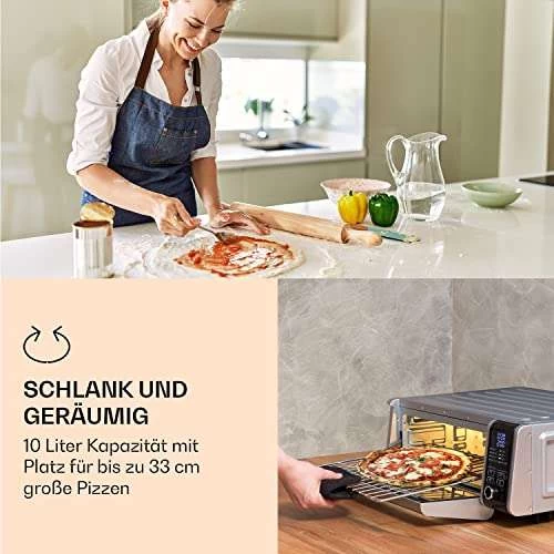 Die Zukunft des Kochens ist da, und sie ist dabei, heiß zu werden. Die Klarstein Fritteusen sind eine gesündere Alternative, um köstliche frittierte Speisen zu genießen, ohne die überschüssigen Kalorien, die beim Frittieren entstehen. Diese 10-Liter-Heißluftfritteuse arbeitet mit Luft statt Öl und ist groß genug, um eine leckere Auswahl an Lieblingsgerichten zuzubereiten, darunter Pommes frites, Hähnchen, Steaks und vor allem 33-cm-Pizzen. Und das Beste daran: Mit 1700 W reiner Leistung heizt der Air Fryer schneller auf als herkömmliche Öfen, sodass du schneller mit dem Kochen fertig bist. Schneide und würze einfach deine Zutaten, wähle dann aus 8 vorprogrammierten Programmen und unsere digitale Fritteuse erledigt den Rest.
