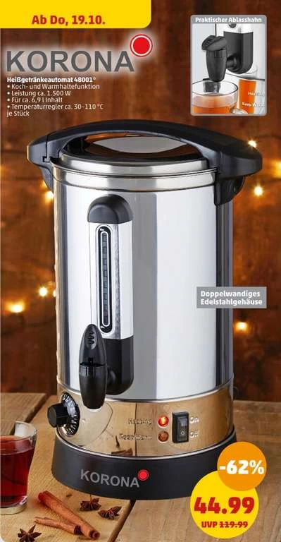 Bei Penny gibt es ab 19. Oktober einen Korona 48001 Heißgetränkeautomaten (Glühweinkocher) für 44,99 Euro statt 69,99 Euro (Amazon).