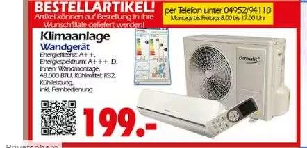 im örtlichen Wreesmann Prospekt (26842 Ostrhauderfehn) ist eine Germatic Split-Klimaanlage zum Preis von 199,– € telefonisch bestellbar (04952/94110) und im jeweiligen Markt abholbar (Übersicht der Filialen: ).