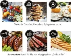 Die robuste Aluguss-Grillplatte ist in zwei Zonen unterteilt: Die strukturierte Fläche eignet sich ideal zum Grillen von Fleisch – typische Grillstreifen inklusive.