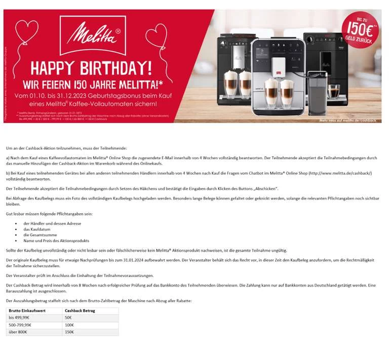 Auf der Suche nach einem Kaffeevollautomaten bin ich auf das Angebot hier gestoßen. Durch den knappen Preis über 500€ bekommt man 100€ Cashback von Melitta.