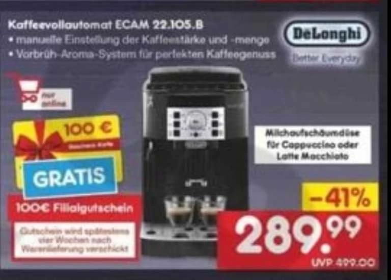 ![[netto Online / Bis 20.11.] De'Longhi Kaffeevollautomat ECAM 22.105.B Mit 100€ Netto Einkaufsgutschein - Effektiv ~175€ Möglich](https://www.hausgerateshop.com/wp-content/uploads/2024/02/2066224_1.webp)