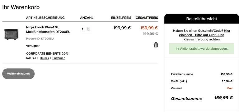 bei Ninja erhält man aktuell die NinjaFoodi 10-in-1 XL Multifunktionsofen DT200EU für 159,99€ mit CB (Ohne CB 199,99€)