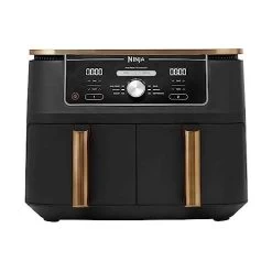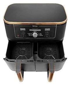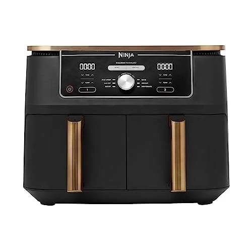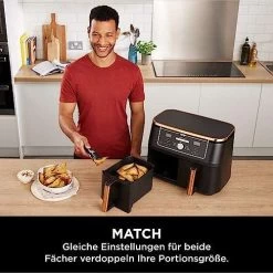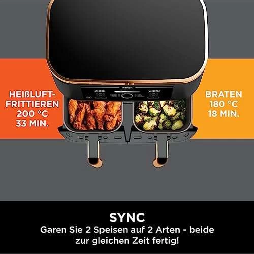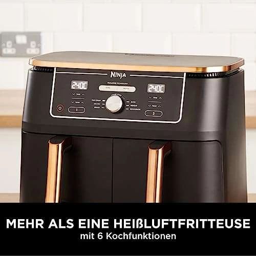 - BEINHALTET: Ninja Foodi MAX Doppelzonen-Heißluftfritteuse (EU-Stecker), Silikon-Zange, 2 spülmaschinenfeste 4,75-Liter-Fächer (9,5-Liter-Gesamtkapazität) und Grillplatten mit Antihaftbeschichtung. Rezept-Anleitungen. Farbe: Kupfer/Schwarz