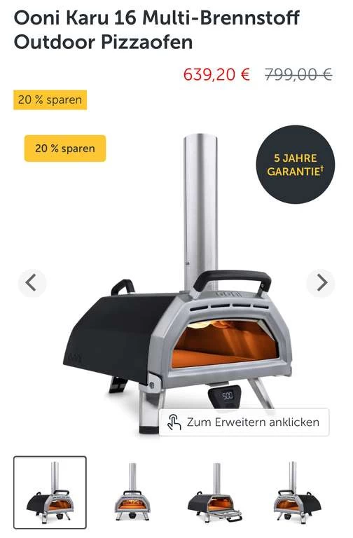 z.B. bekommt ihr den Ooni Karu 16 für 639.20€ statt 675€ (günstigsten Preis den ich bis jetzt gesehen habe). Ich werde Morgen testen, ob ich mit der Hornbach TPG noch günstiger weg komme.
