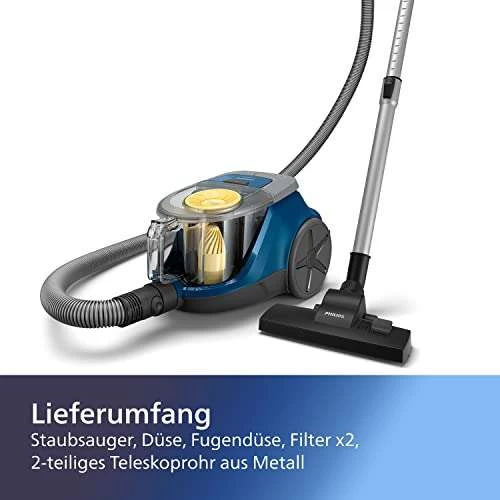Lieferumfang: Philips Staubsauger, Mehrzweckdüse, Fugendüse, Super-Clean-Luftfilter, abwaschbarer Filter, 2-teiliges Teleskoprohr aus Metall