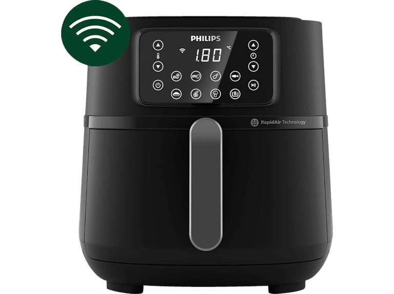 Philips Airfryer XXL 5000 Series HD9285/90, bis zu 6 Portionen, 7,2 l (1,4 kg) Fassungsvermögen, mit der NutriU AppEin vernetzter Begleiter für gesunde Mahlzeiten ist der Philips Series 5000 Airfryer Connected Airfryer XXL HD9285/90. Dank 16 verschiedener Kochfunktionen überzeugt er durch Vielseitigkeit und Multifunktionalität und ermöglicht die Zubereitung abwechslungsreicher Speisen. Nach Belieben lässt sich das Gerät zum Backen, Grillen, Toasten sowie auch Rösten, Aufwärmen oder Fermentieren einsetzen. Für ein gesundes Frittieren verzichtet es auf die Verwendung von Öl und verwendet eine Rapid Air Technologie mit heißer Luft. Durch das Fassungsvermögen in XXL-Größe lassen sich mit dem Philips Series 5000 Airfryer Connected Airfryer XXL HD9285/90 bis zu sechs Portionen in einem Durchgang zubereiten.