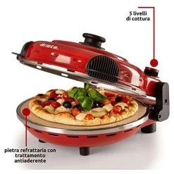 Der Pizzaofen von Ariete ist der Verbündete eines jeden Pizzaliebhabers:! Diese Elektro-Pizzahaube steigert ihre Leistung dank einer hochwertigen feuerfesten Steinplatte mit einem Durchmesser von 32 cm, die das Backen und/oder Erhitzen von Pizza und Quiche auf fünf Kochstufen bis zu einer maximalen Temperatur von 400 Grad ermöglicht. Der feuerfeste Stein ist mit einer transparenten Antihaft-Beschichtung versehen, was ihn unempfindlich gegen Flecken und Rückstände macht und für eine beständig hohe Qualität sorgt.Das schnelle Garen bei hoher Temperatur ermöglicht es Ihnen, die gleiche Methode wie beim Holzofen Pizza-Backen anzuwenden, und in nur 4 Minuten ist die Pizza perfekt gebacken. Für Tiefkühlpizza werden nur 2 – 3 Minuten benötigt. Pizza bei sich zu Hause zu genießen war noch nie so schnell und einfach. Probieren Sie es aus!Neuer feuerfester Stein mit transparenter Antihaft-Beschichtung, was die Reinigung erheblich erleichtert und beschleunigt, sowie eine noch bessere Leistung und eine längere Haltbarkeit des Steins gewährleistet.