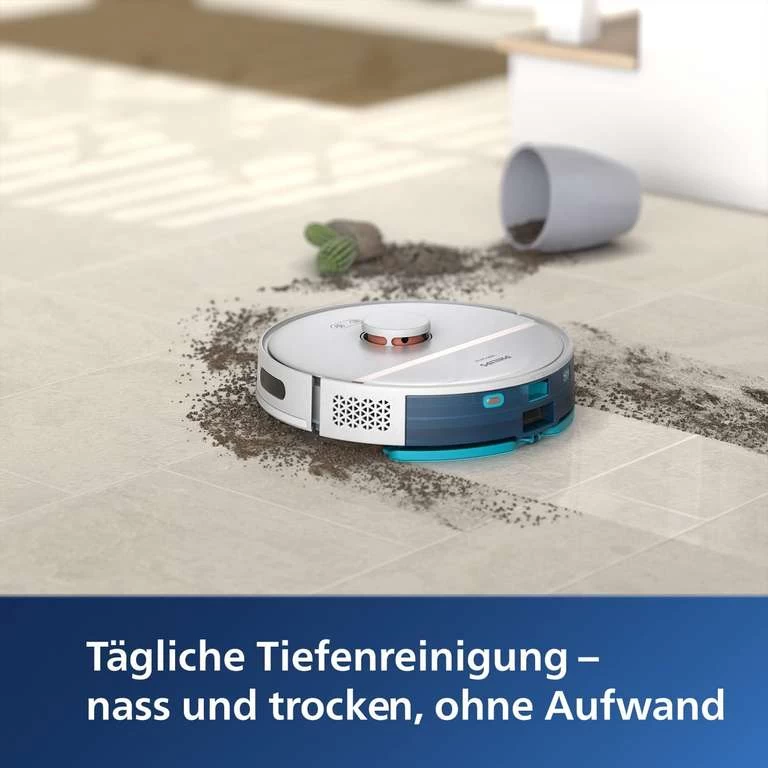 - Der Roboter saugt und wischt Hartböden in einem Durchgang und entfernt die feine Staubschicht, die sich auf dem Boden ansammelt. Das Gerät entfernt mehr Feinstaub als nur mit Staubsaugen, sodass Ihre Fußsohlen barfuß in der Wohnung sauber bleiben