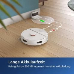 - Lange Akkulaufzeit: Dank des leistungsstarken 4800 mAh Li-Ion-Akkus kann der Roboter mit einer einzigen Ladung bis zu 200 Minuten oder über 185m² reinigen. Er kehrt zum Aufladen automatisch zur Station zurück und setzt die Reinigung danach fort