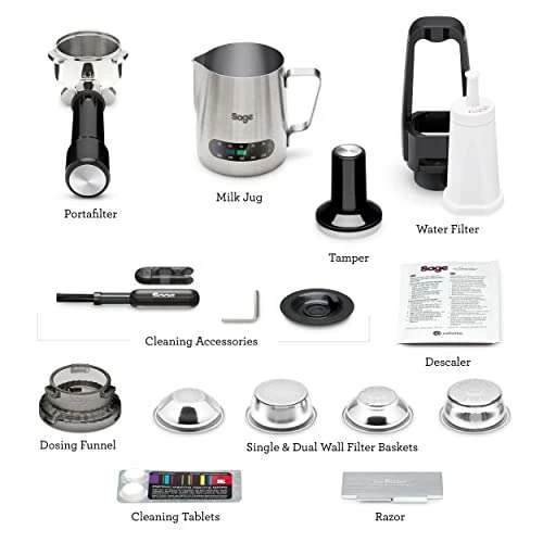 - ENTHALTENES ZUBEHÖR: Razor Dose Trimming Tool, 54mm Edelstahl Siebträger, ,ein- und doppelwandige Filterkörbe (1 und 2 Tassen), integrierter Tamper, Edelstahl Milchkännchen, Reinigungsscheibe & -tabletten, Bürstenwerkzeug & Inbusschlüssel, Wasserfilter & Filterhalterung