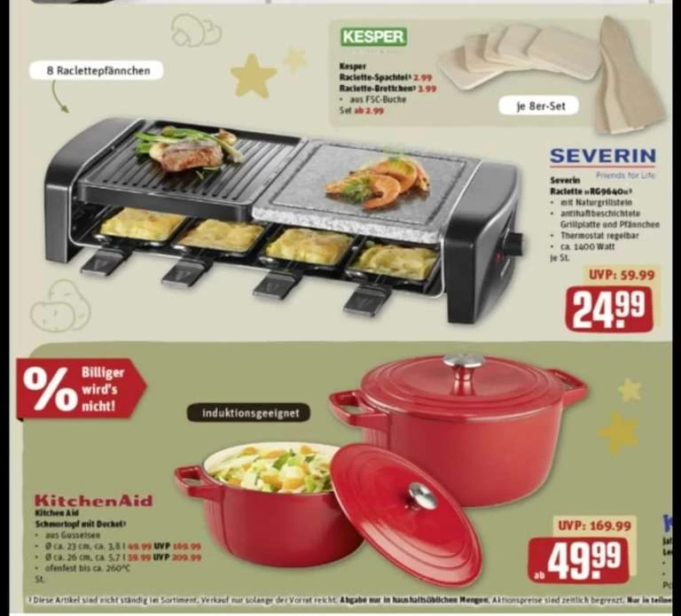 Im Rewe gibt es gute Angebote für ein Raclette mit Naturstein von Severin und Schmortöpfe von Severin.