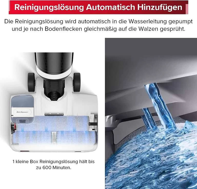【Automatische Reinigung & Automatische Dosierhilfe】Der Wischsauger reinigt automatisch bei jeder Umdrehung. Die Walzenbürste dreht sich abwechselnd vorwärts und rückwärts und reibt und kratzt wiederholt mit dem Schaber, um den Schmutz gründlich zu reinigen. Die Reinigungslösung wird automatisch in die Wasserleitung gepumpt und gleichmäßig auf die Walzen gesprüht. Es passt sich je nach Bodenflecken automatisch an, 1 kleine Box Reinigungslösung hält bis zu 600 Minuten.