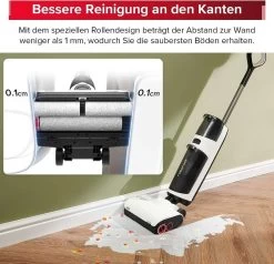 【Bessere Reinigung an den Kanten】Mit 1 langen Bürste und 2 hinteren Bürsten beträgt der Reinigungsabstand entlang der Wand weniger als 1 mm, wodurch der Schmutz an der Kante vollständig abgedeckt wird. Der Kopf kann um 180° gedreht werden, um die Tisch- oder Stuhlbeine leicht zu reinigen. Es kann mühelos hin und her geschoben werden, einfacher zu manövrieren.