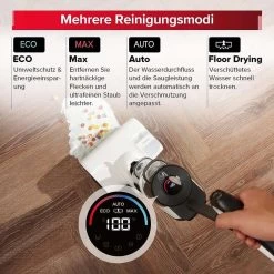 【Intelligente Erkennung】Der Infrarotsensor erkennt den Schmutz auf der Bürste, um die Saugleistung und die Wassermenge automatisch anzupassen. Unterstützung der Sprachaufforderungsfunktion. 4 Reinigungsmodi, ECO: Umweltschutz & Energieeinsparung. Auto: Der Wasserdurchfluss und die Saugleistung werden automatisch an die Verschmutzung angepasst. Max: Entfernen Sie hartnäckige Flecken und ultrafeinen Staub leichter. Floor Drying: Verschüttetes Wasser schnell trocknen.