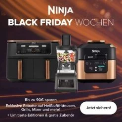 Falls ihr gerade überlegt, eure Küchengeräte zu erneuern oder zu ergänzen, lohnt sich momentan vielleicht ein Blick in den Ninja Online Shop. Dort gibt es aktuell auf einige Produkte wie Heißluftfritteusen, Grills und Mixer Rabatte von bis zu 90€. Zusätzlich bietet der Shop einige limitierte Editionen und gratis Zubehör an.