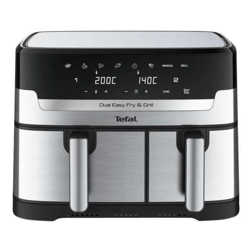 Alles in einem: Doppelter Genuss, unendliche Vielfalt! Entdecken Sie die 8.3-Liter-Doppelkammer Heißluftfritteuse von Tefal, mit der Sie in einem Durchgang komplette, hausgemachte Mahlzeiten für die ganze Familie zubereiten können! Dual Easy Fry & Grill verfügt über zwei unabhängige Schubladen, in denen zwei verschiedene Gerichte gleichzeitig auf den Punkt zubereitet werden können – von köstlichen hausgemachten Pommes Frites bis hin zu Fisch und Gemüse. Dank der 2 unabhängigen Garzonen können Sie die Kochprogramme, Garzeiten und Temperaturen in beiden Schubladen individuell einstellen und so im Handumdrehen köstliche Gerichte zaubern. Mit der Synch-Funktion passen Sie die unterschiedlichen Zubereitungzeiten aufeinaner ab und können so alles zur gleichen Zeit servieren. Die 8 voreingestellten Garprogramme ermöglichen es Ihnen, Speisen ohne Überwachung mit Heißluft zu frittieren, zu braten, zu backen und zu grillen, während die Reinigung dank der spülmaschinenfesten Teile ein Kinderspiel ist. All das bedeutet weniger Zeit in der Küche und mehr Zeit für sich und die Familie – ideal für stressige Tage!
