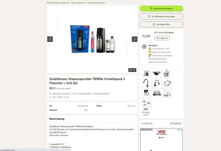 Lokaler Geheimtipp:Wenn ihr jedoch aus Hamburg seid oder die Möglichkeit habt, den Artikel vor Ort abzuholen, dann solltet ihr unbedingt bei Kleinanzeigen vorbeischauen. Dort bietet derselbe Verkäufer den SodaStream für nur 49€ +5€ DHL Versand an! Das ist schon ein ordentlicher Rabatt.