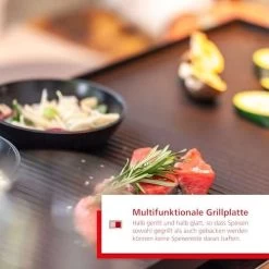 BEIDSEITIG VERWENDBARE GRILLPLATTE – Beidseitig verwendbare Grillplatte: 1 Seite gerillt und flach für Fleisch und Gemüse, 1 Seite für Mini-Wok und Crêpes, Zuschaltbare Unterhitze für Mini-Pizza