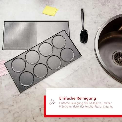 EINFACHE REINIGUNG – Einfache Reinigung dank Antihaftbeschichtung auf Pfannen und Grillplatte: Abwaschen mit Wasser, Trocknen mit Haushaltstuch, Abnehmbare Grillplatte