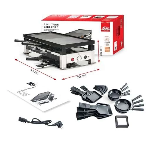 Solis 5 in 1 Table Grill 791 Raclette 8 Personen – Raclette + Tischgrill + Wok + Pizza Grill + Crêpes – Elektrogrill – 1400W – Edelstahl