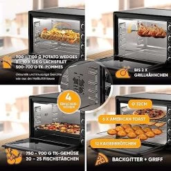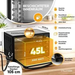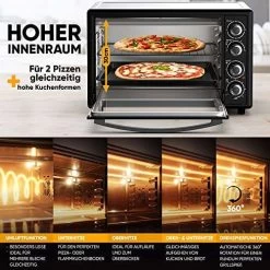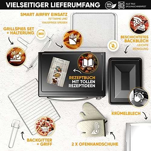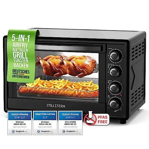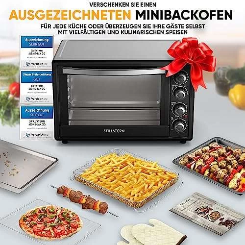 Stillstern Minibackofen mit Umluft (45L) Deutsche Version, 2x Backblech, Ofenhandschuhe, Rezeptheft, Drehspieß, Innenbeleuchtung, 2000W, Toaster Grill Pizzaofen Mini Backofen ideal für Camping.