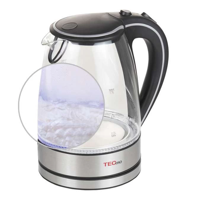 Der Glaswasserkocher WK 1506 von TecTro (1.850 – 2.200 Watt) hat einem Fassungsvermögen von ca. 1,7 Liter, LED-Beleuchtung und Überhitzungsschutz. Der 360 °-Sockel, das verdeckte Heizelement und der KSL-Controller runden die Vorteile dieses Kabellosen Wasserkochers ab.