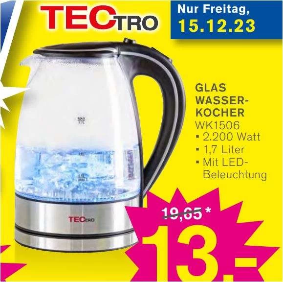 Bei Kodi bekommt ihr am 15.12. den TecTro Glaswasserkocher WK1506 für nur 13 Euro.