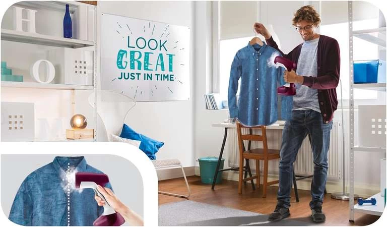 - Praktisches Zubehör: Textilbürste für schwere Stoffe, Dampfaufsatz für empfindliche Gewebe und Kleiderbügelhalter für das mühelose Dampfglätten überall und jederzeit